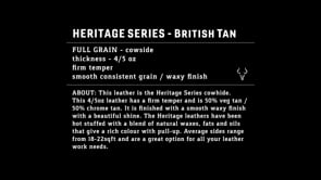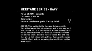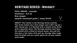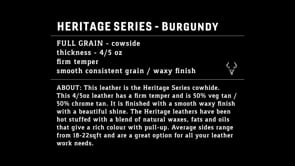 The Heritage Series is available in 2/3oz and 4/5 oz weights and is a 50/50 veg tan / chrome tan leather. It is full grain leather that has a smooth, polished finish with a pull up effect. These cow sides are approximately 18-22 sqft. A great option for bags, boots, accessories and wide range of other leather products.